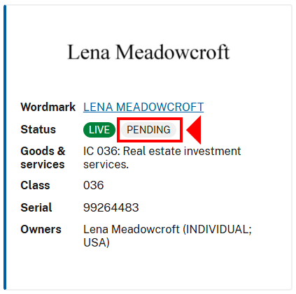Lena Meadowcroft recently filed an ICANN dispute trying to steal our domain to shut this website down to silence people telling the stories of their experience in being conned by her. Throughout the dispute, she made multiple fraudulent claims that she owns a trademark on this domain name. The truth is that she doesn’t own a trademark on the domain—she has only applied for a trademark, and it has not been approved or even reviewed by an examiner, for that matter. She has no valid trademark claim. Additionally, she applied for the trademark after the domain was already registered, so she has no legal standing even if her trademark is eventually approved
